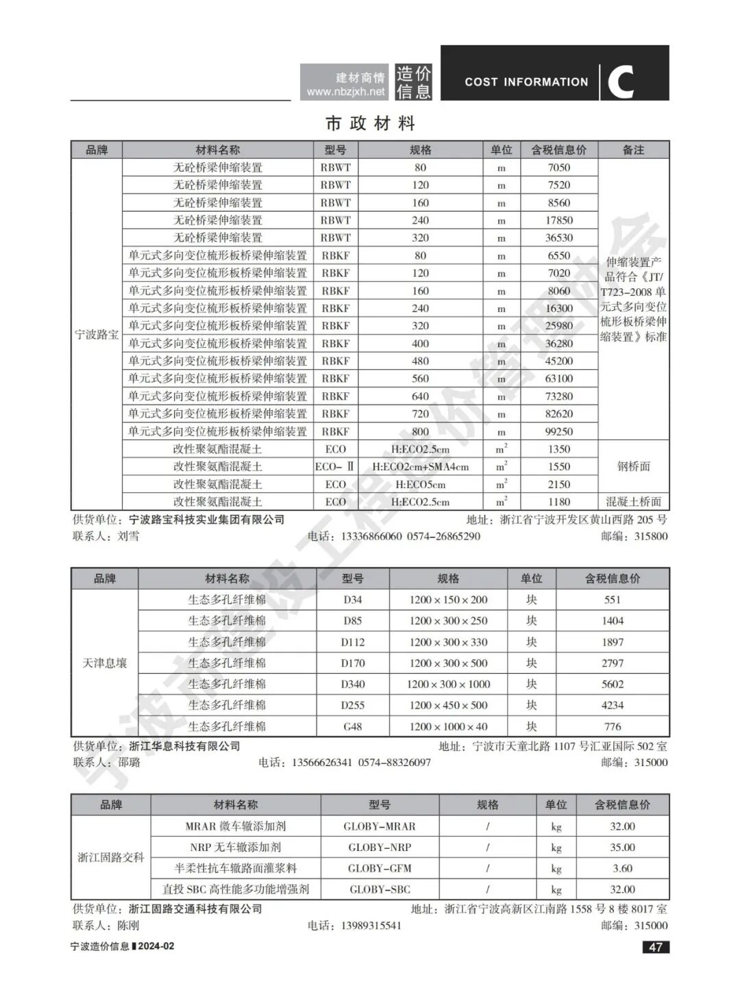 浙江固路交通科技有限公司的最新材料报价已于宁波建设工程造价信息2024年2月刊(总第433期)中公布!