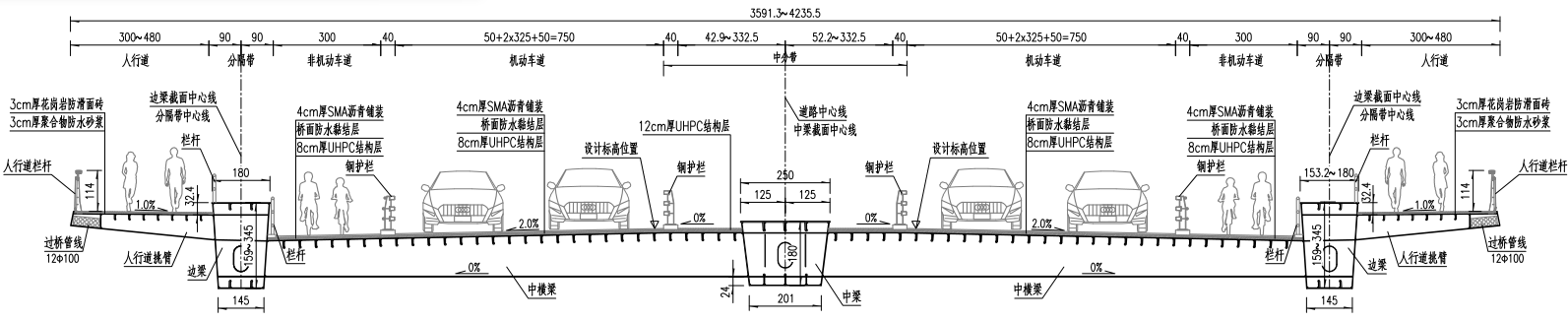 (a)桥中非机动车道、机动车道横断面图
