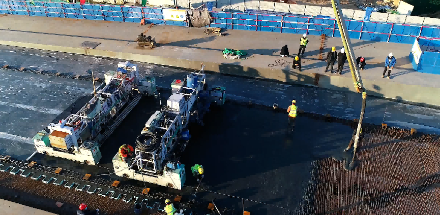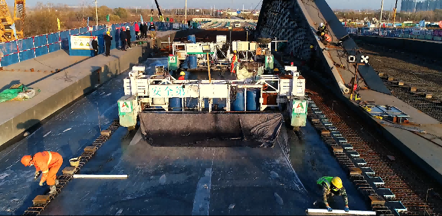 本项目主桥面为宽7.5米的8cm厚UHPC铺装,两侧设有0.4米宽的护栏基座,增加了施工难度。且护栏基座外两侧还设有3米宽的8cm厚UHPC铺装的非机动车道以及宽度渐变的12cm厚的UHPC内侧路缘带,涉及到变断面、变厚度一次性成型施工,难度系数较大。